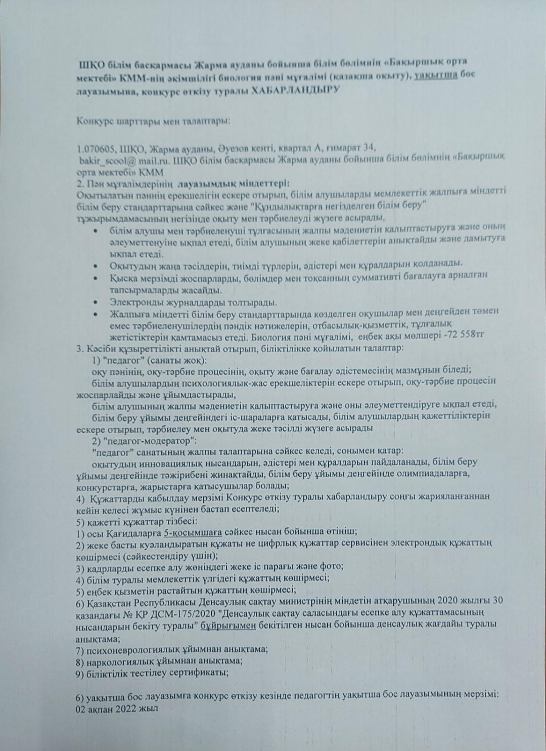 Уақытша бос лауазымына конкурс өткізу туралы ХАБАРЛАНДЫРУ