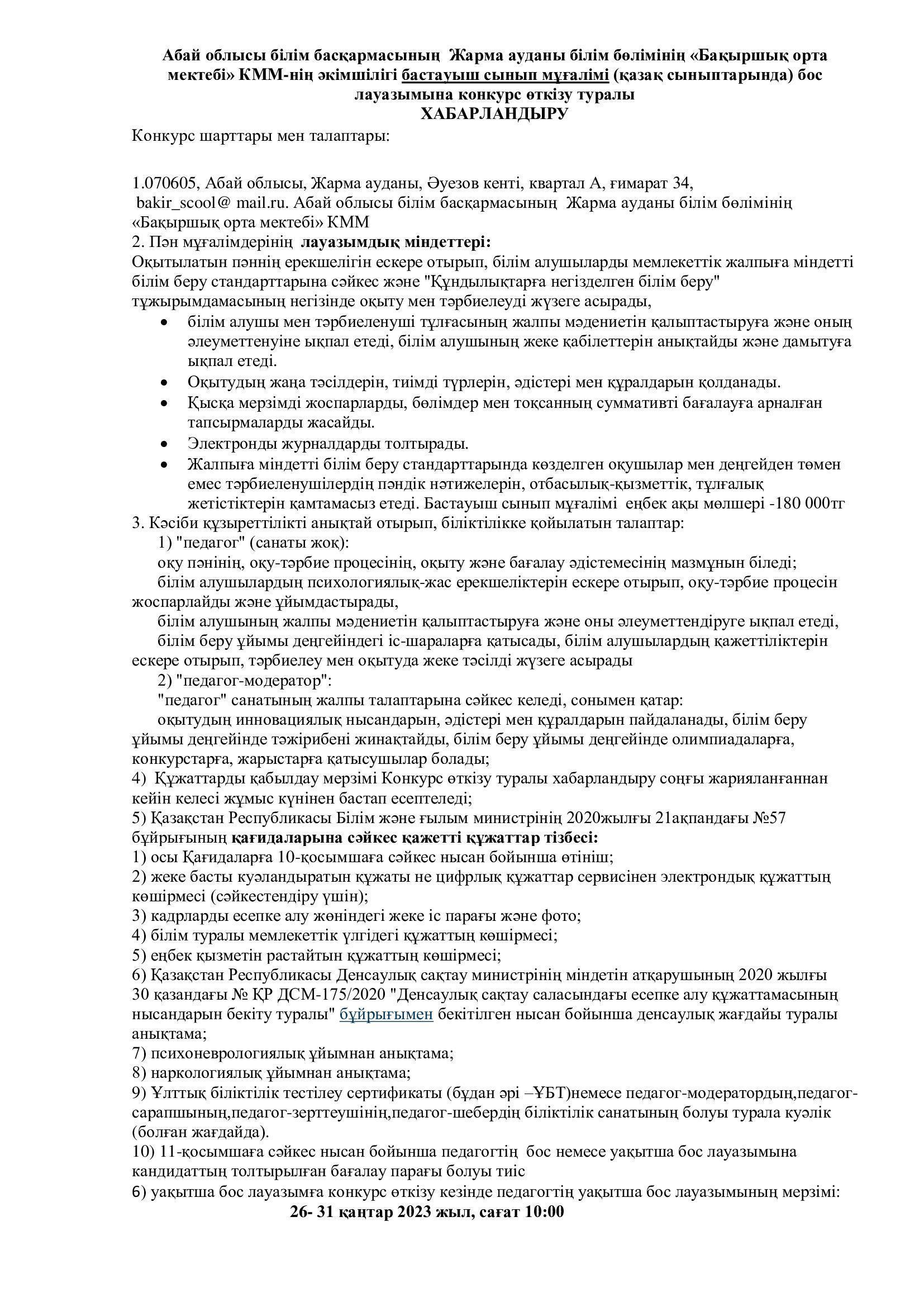 26 январь 2023 0 1 2 3 4 5 бастауыш сынып мұғалімі (қазақ сыныптарында) бос лауазымына конкурс өткізу туралы ХАБАРЛАНДЫРУ Бастауыш сынып мұғалімі (қазақ сыныптарында) бос лауазымына конкурс өткізу туралыХАБАРЛАНДЫРУ