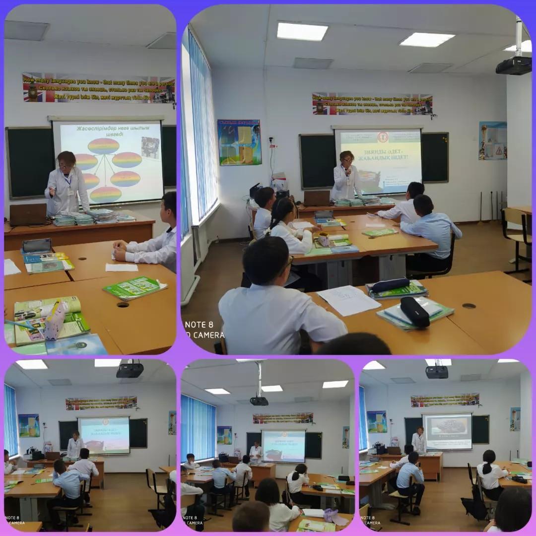 Абай облысы білім басқармасының нашақорлыққа және есірткінің заңсыз айналымына қарсы профилактикалық іс-шаралар жоспарына сәйкес мектеп медбикесі Сатимова Б. Т. "Зиянды әдет - жаһандық індет " тақырыбында оқушылар арасында түсіндіру жұмыстарын жүргізді.