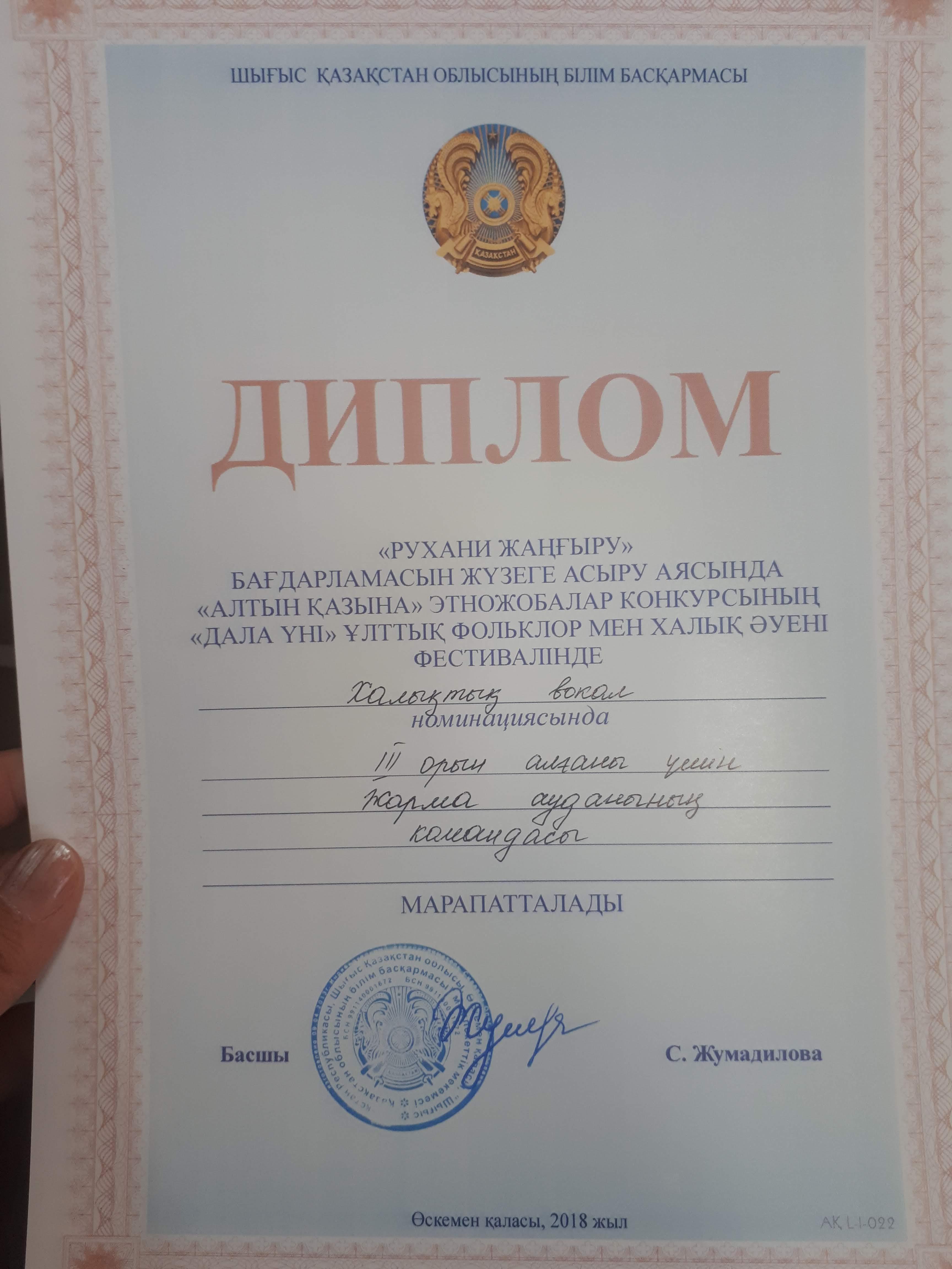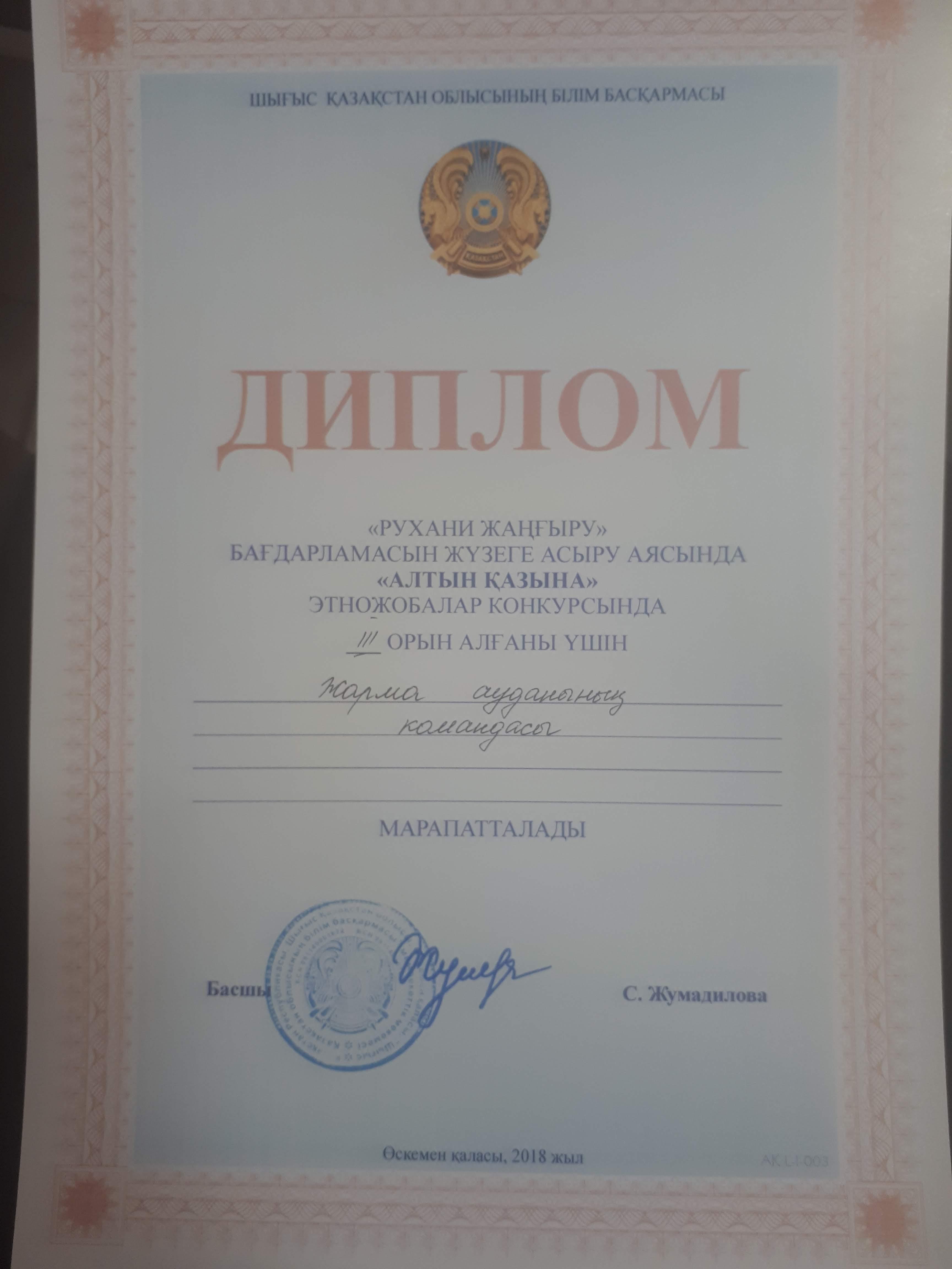 22 ноябрь 2018 0 1 2 3 4 5 Областной конкурс этнографических проектов Команда учащихся КГУ «Средняя школа Бакырчик» приняла участие в Областном конкурсе этнографических проектов «Алтын қазына» и заняла 3 место Научный руководитель: Шаяхметова А.Ш.