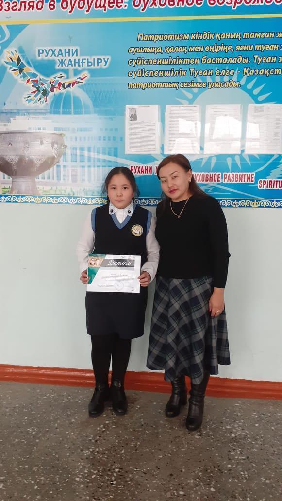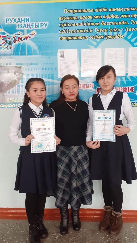 8 "Б" сынып оқушысы Мыңбаева Гаухар "Мен өз Отанымды мақтан тұтатын азаматпын" қашықтықтан өткізілетін онлайын шығарма байқауында 2 орын және 8 "А" сынып оқушысы Ахметкәрімова Толғанай облыстық "Алтын Адам - Тәуелсіз Қазақстанның символы" эссе байқауында 3 орын. Пән мұғалімі: Жанасылова Р.С