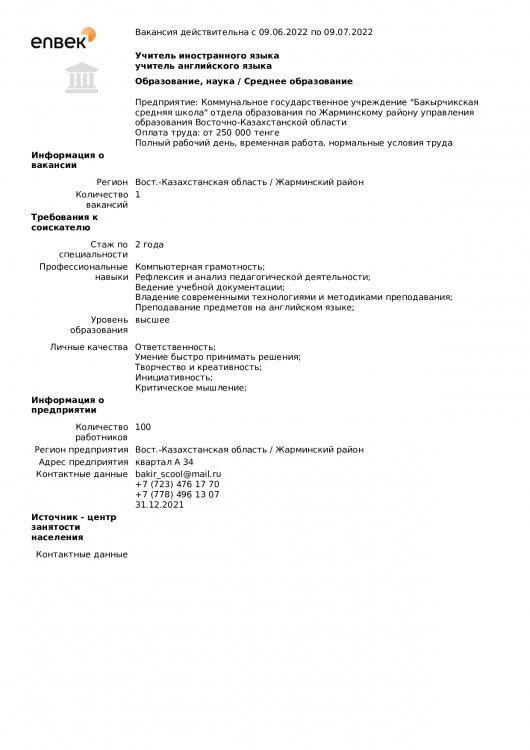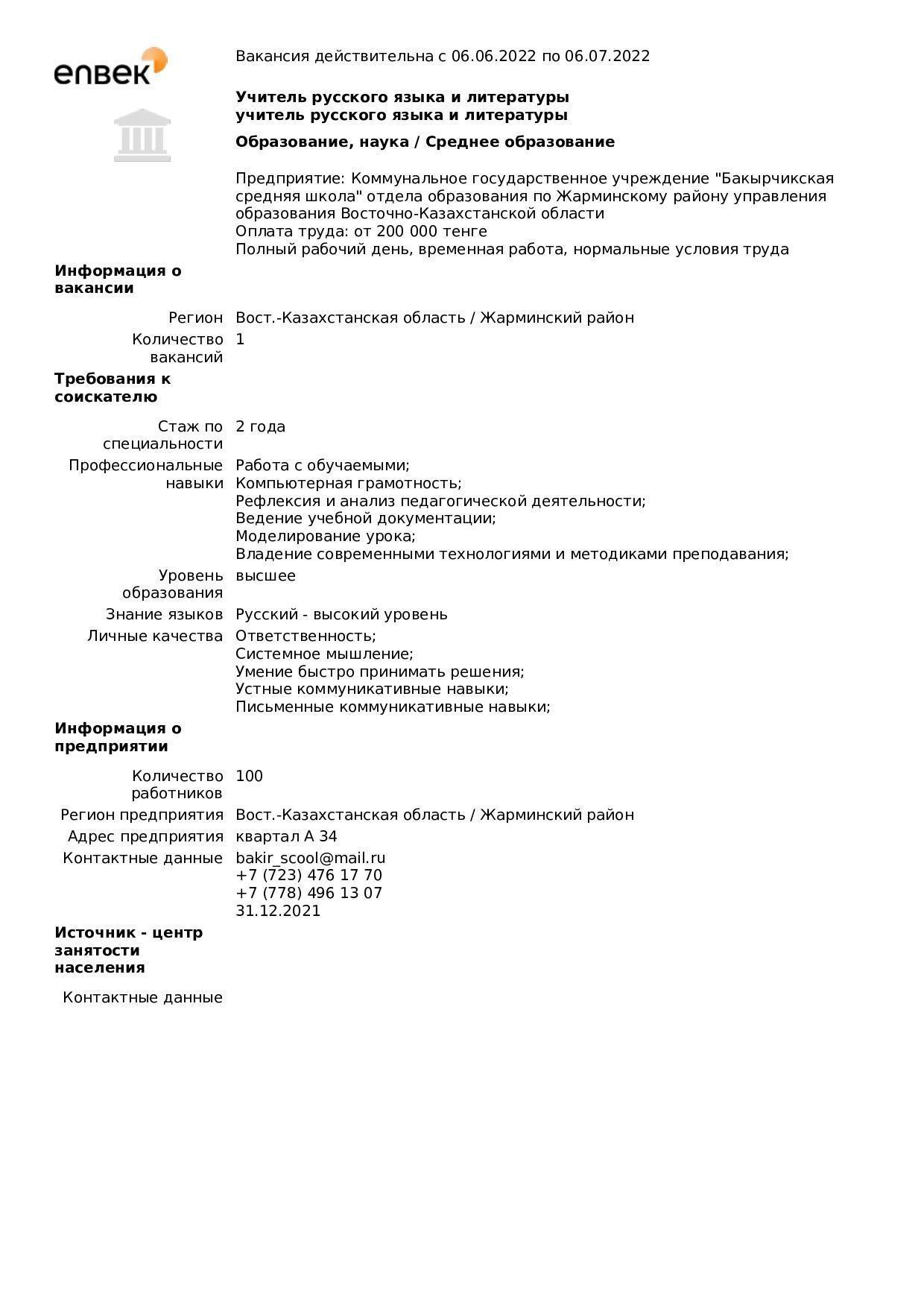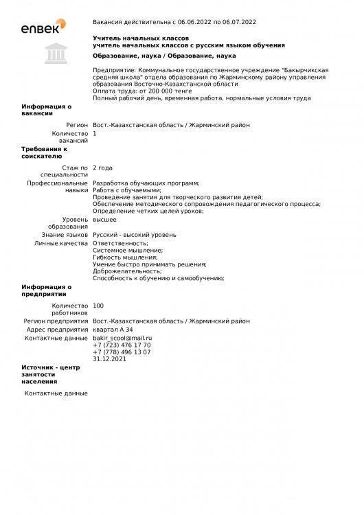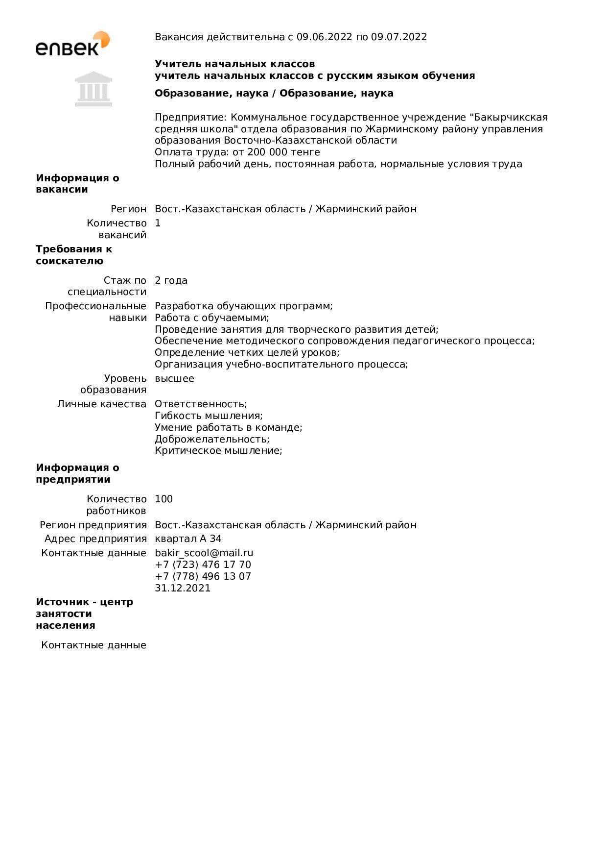 "Бақыршық орта мектебі" КММ бойынша вакансиялар