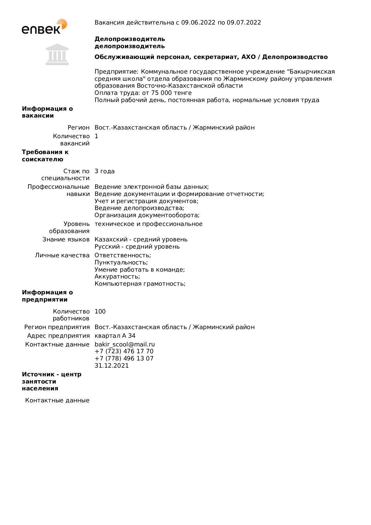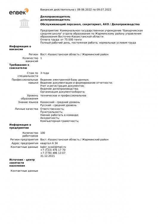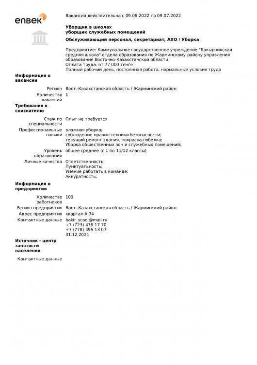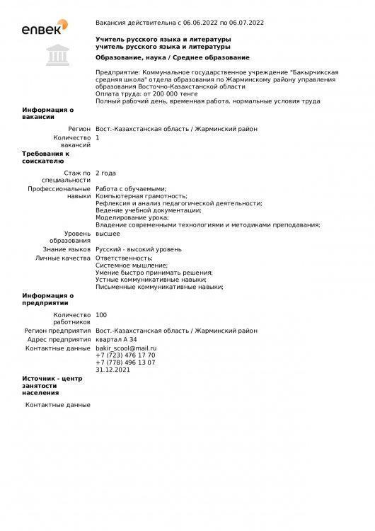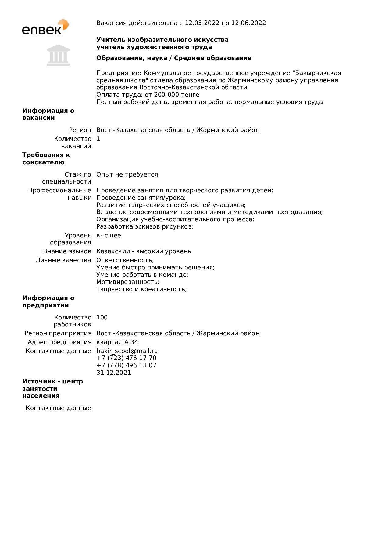 "Бақыршық орта мектебі" КММ бойынша вакансиялар