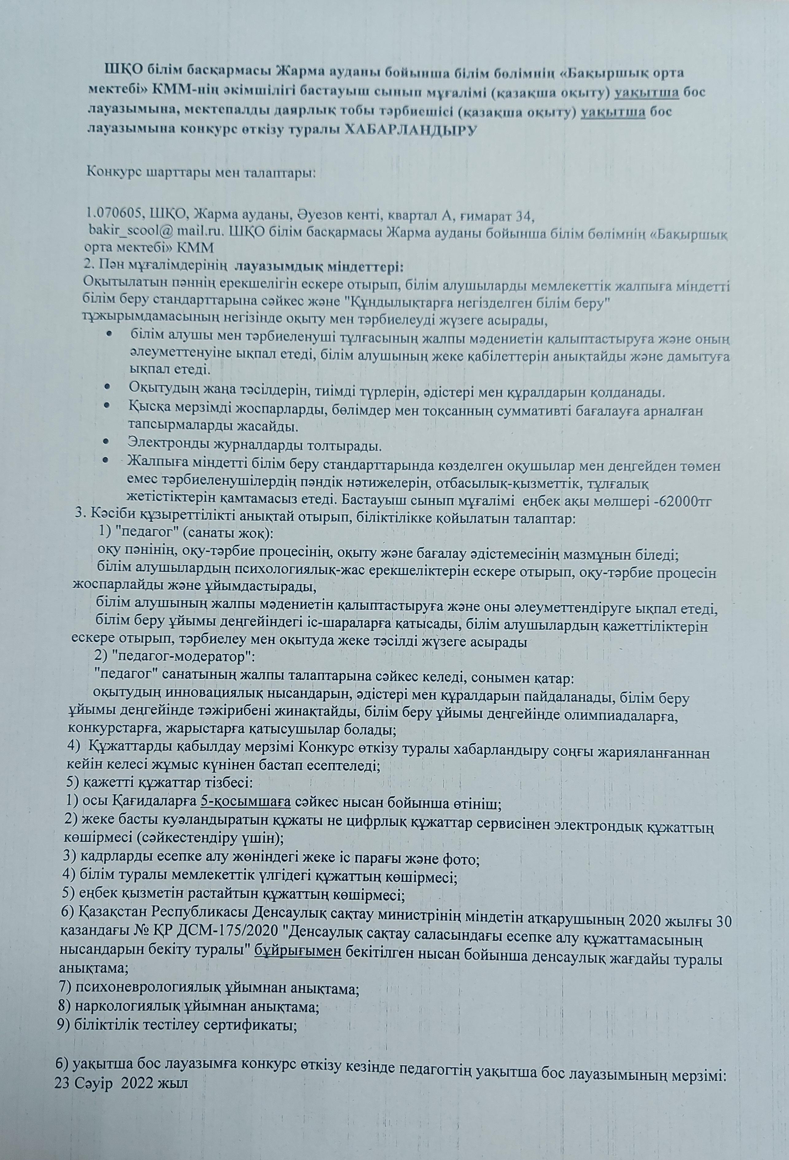 » Уақытша бос лауазымына конкурс өткізу туралы ХАБАРЛАНДЫРУ