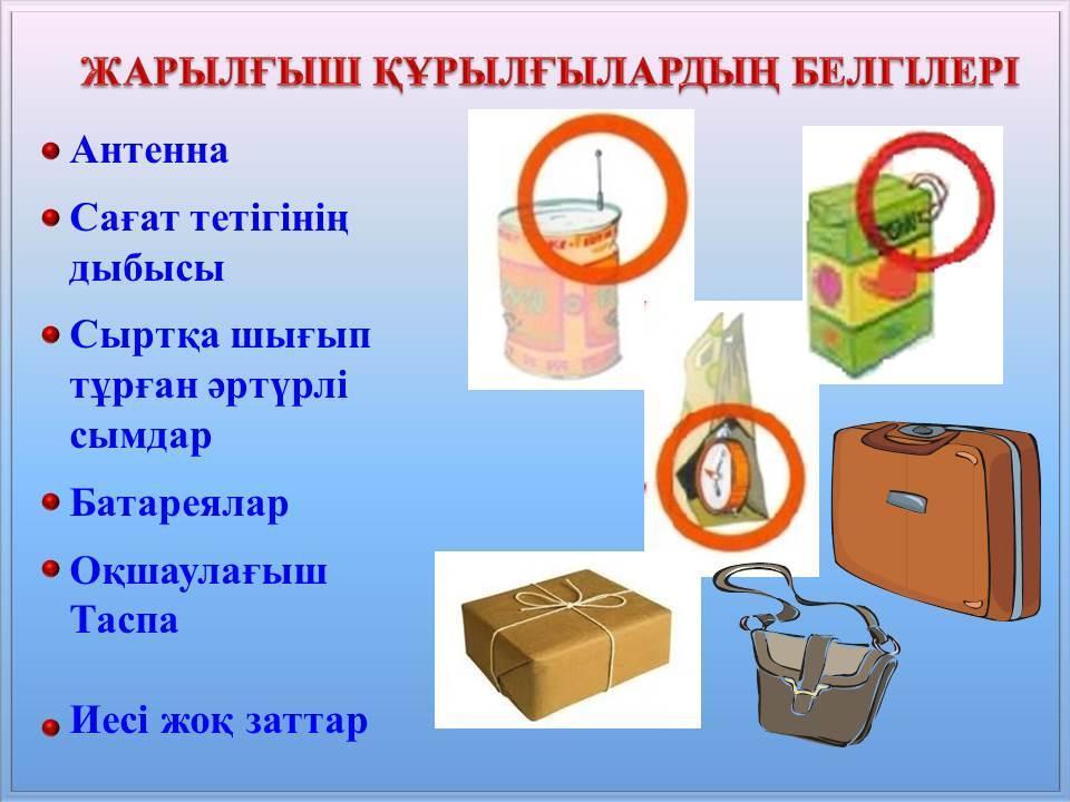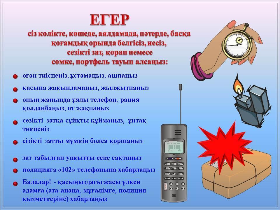 табылған күдікті затты ұстамаңыз, жақындамаңыз, жылжытпаңыз! Радиобайланыс құралдарын, оның ішінде ұялы байланыс құралдарын осы заттың жанында пайдаланудан тартынуға; күдікті заттың табылғаны туралы ҰҚК, ІІМ және ТЖМ аумақтық органдарының кезекші бөлімдеріне дереу хабарлауға; табылған уақыты мен орнын белгілеуге; мүмкіндігінше күзет бөлімшесінің күшімен күдікті зат пен қауіпті аймаққа бөгде адамдардың кіруін шектеуді ұйымдастыруға; қауіпсіздік қызметі органдарының дүрбелең жасаңыз. Қауіпті аймаққа іргелес аумақтан адамдарды ұйымдасқан түрде эвакуациялауды қамтамасыз ету (қамтамасыз етуге көмектесу);